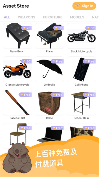 2、拥有上百种道具包,分为免费与付费两种类型。这些道具包内含有诸如日系动漫风格的课桌椅,以及魔幻风格的刀剑、盾牌等常用道具。