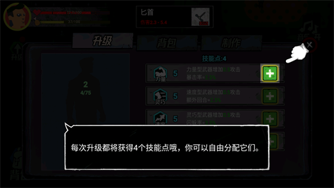 1、加点方面。加点需依据武器来进行,无论处于何种模式,推荐的武器发展路线大致为:菜刀/木棍→员工→机械斧→飞刀。