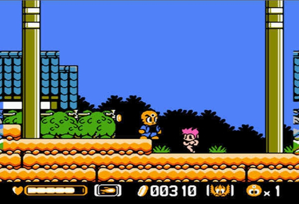 《三目童子》由Tomy公司于1992年发行,以漫画《三眼神童》为蓝本,简化原作复杂叙事,聚焦“英雄救美”的线性剧情。玩家扮演写乐保介,通过五大战役(城市、户外、森林、海上、轮渡)挑战三眼族王子哥达尔,最终夺回被封印的第三只眼。游戏分Easy和Normal难度,后者需购买急救鸟避免坠落死亡。