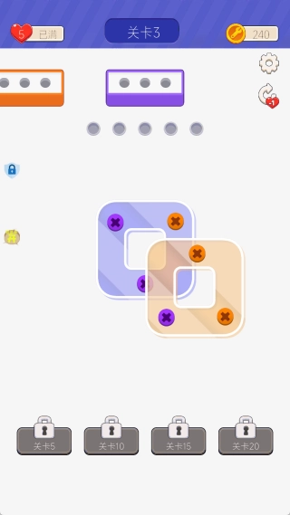 3、各种道具能帮助玩家快速闯关,出现失误时可以使用道具进行补救,重新开始拔钉子。