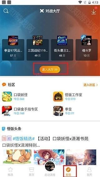 1、在本站完成软件安装后启动软件,进入软件首页,即可浏览到各类优质游戏推荐; 2、在页面最下方找到并进入发现专区,随后在专区上方看到对战大厅入口,直接点击“进入大厅”按钮即可。