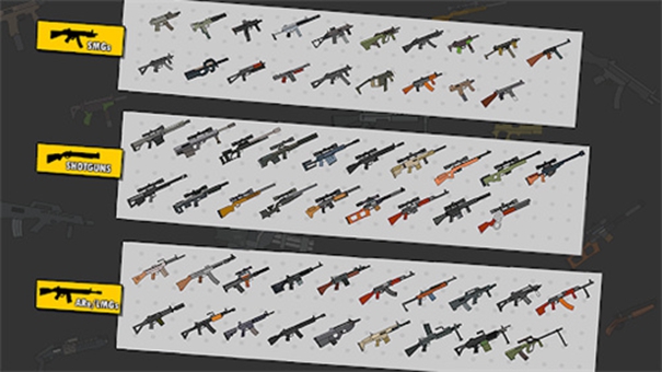 多样的武器库:包含数十种功能各异的武器,分为枪械、钝器、锐器、投掷物等类别。每类武器都有独特的攻击模式与击退效果。