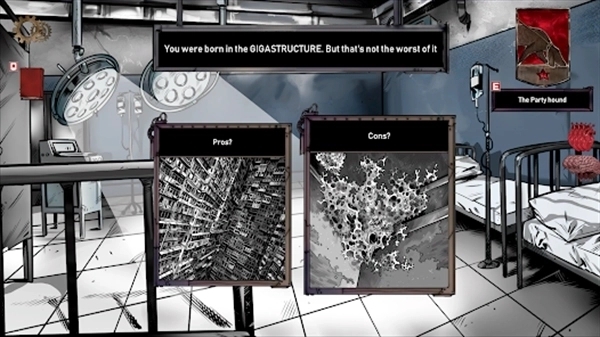 反乌托邦世界观:基于《Gigastructure》世界观构建,通过精美2D插画呈现压抑、荒芜的环境,强化沉浸感。