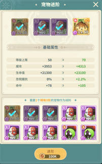 宠物提升到一定等级后可消耗指定宠物进阶,进阶后宠物的等级上限会有所提升。