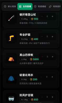 装备自定义:支持调整背包容量、帐篷保暖性等参数,不同配置影响负重与生存效率,鼓励玩家根据路线特点优化装备。