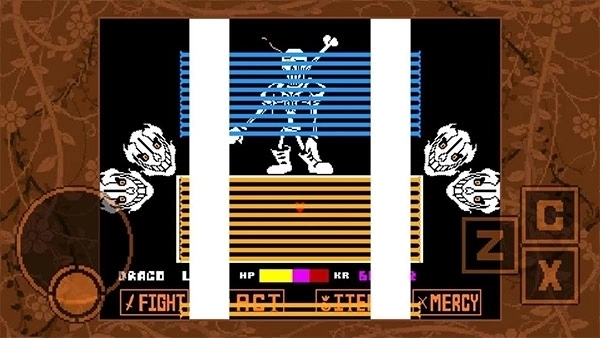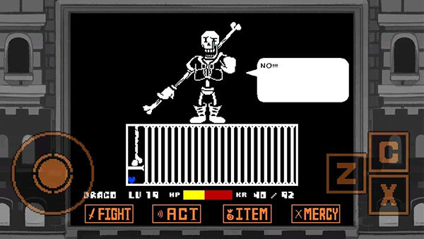采用回合制战斗系统,敌人攻击模式随阶段升级。例如,Papyrus在第二阶段会替换物品为“意大利面条”(实际可回血),第三阶段召唤Sans与Undyne的灵魂强化攻击。玩家需观察弱点、利用环境障碍物躲避,并合理分配攻击与防御节奏。