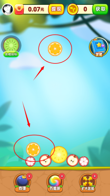 3、相同的水果就能完成合成,要注意控制下落的位置