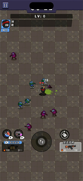 3、滑动中心按钮来躲避敌人的攻击,和他们保持一定距离,英雄会自动射击并刷新子弹。