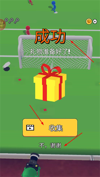 4、进球成功后,可以按照需要选择收集看广告领奖励,或者点击不,谢谢继续挑战。