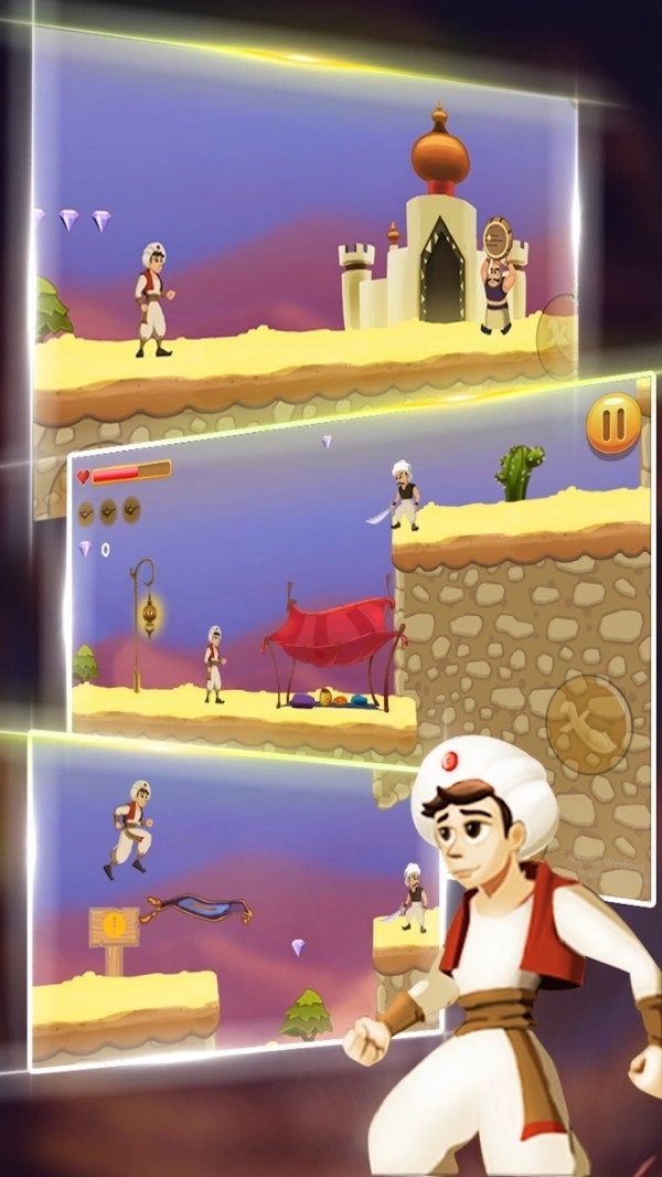 阿拉丁神灯冒险记手机版是一款动作冒险闯关游戏,采用可爱清新的卡通画风。在游戏里,玩家将化身为机智的年轻人,施展梦幻般的技巧,不断击败敌人;随着关卡推进,敌人的防守力量会越来越强。你需要借助神灯的帮助,从恶魔手中救出被困的公主——神灯精灵会一直协助你,甚至会为了你与身边的恶魔战斗。快来《阿拉丁神灯冒险记》开启体验吧!