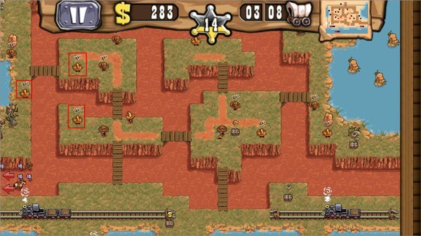 《枪之荣耀》是一款极具特色的塔防游戏,处处洋溢着美国西部牛仔的独特风情。这款游戏由handygames公司倾力打造,兼容android、ios与java三大平台。它别出心裁地采用反派视角展开叙事,让玩家得以沉浸式体验西部大盗的传奇人生。游戏画面通过细腻的2D艺术手法精心呈现:漫天飞舞的黄沙荒野、挺拔高耸的仙人掌群、疾驰而过的蒸汽火车,还有西部电影里经典的大篷车,以及那群带着疯狂劲儿的西部大盗们,每一处细节都完美复刻了老派西部电影的复古韵味。