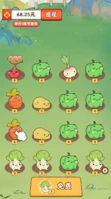 这是一款轻松有趣的合成类游戏,画面清新简约,各类作物都设计成了萌萌的小人造型,带来了舒适的视觉享受。游戏玩法十分简单,玩家只需持续种植获取植物,再通过拖动操作完成合成,每次合成都会有奖励,而且合成出的作物等级越高,对应的奖励也会更加丰厚!
