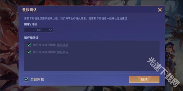 4、之后选择国家/地区、勾选协议并点击继续;