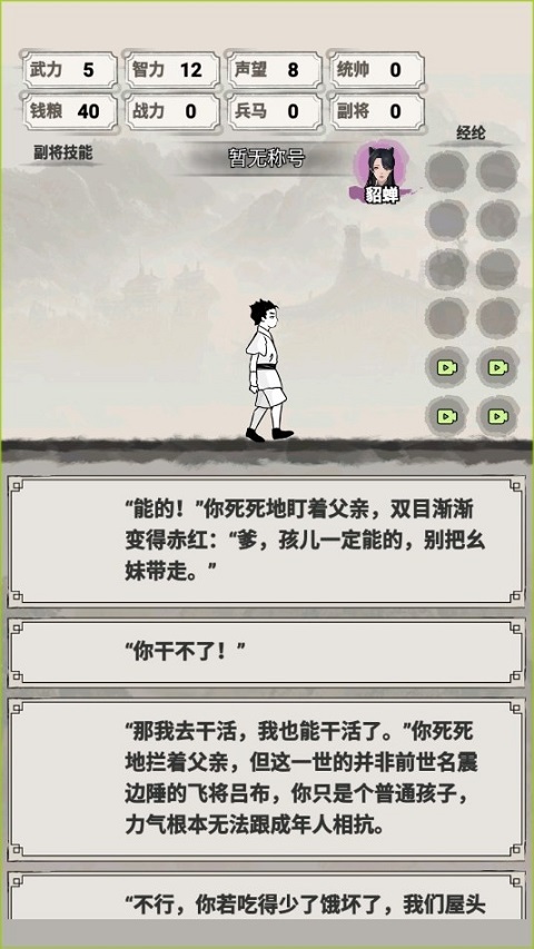 3、点击屏幕就能开启游戏,吕布将从出生起逐步成长,成长进程以“年”为单位来推进,在这个阶段你得做出多次选择,这些选择会直接左右左上角属性的变化。