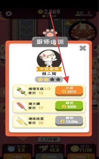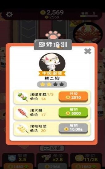 3、进入厨师培训界面,消耗资源(如金币)为厨师(如林二狗)升级技能、解锁新菜品,增强餐厅实力。