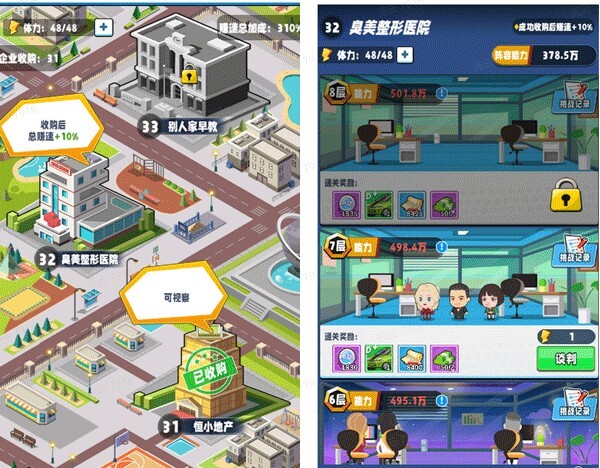 商业都市手机版是一款极具特色的放置类模拟经营游戏。在这座繁华喧嚣的商业都市里,玩家将化身商业巨擘,凭借巧妙的布局构思与精准的策略规划,一步步构建并壮大自己的商业版图。游戏巧妙融合了城市建造、商业运营、员工培育等多元玩法,让玩家沉浸式体验从白手起家到商业大亨的逆袭之路。在这里,你可以自由搭建各类商业设施、发掘并培养精英人才、制定灵活多变的市场策略,还能与全球玩家同台竞技,展开一场场惊心动魄的商业博弈。现在,准备好迎接挑战,书写专属于你的商业传奇吧!