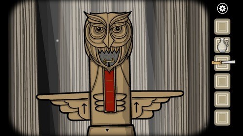 11、退出房屋,调查左下角的猫头鹰,将水蛭放进嘴巴里然后抬高两侧的翅膀将水蛭变为血水,四只水蛭都变为血水以后可以在猫头鹰的嘴巴里得到钥匙。