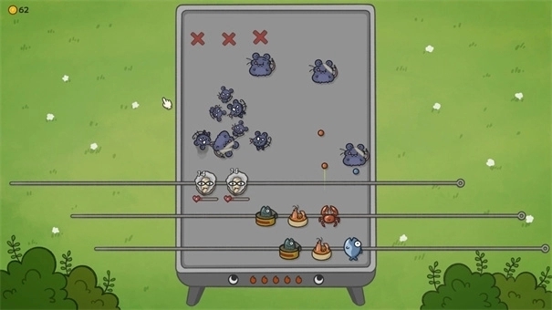 游戏以街头烧烤摊为背景,玩家需守护烤炉免受鼠鼠一族抢夺。鼠鼠种类多样,包括高速型、装甲型、分裂型等,需针对性布置防线。玩家通过拖拽烤串调整攻击位置,利用食