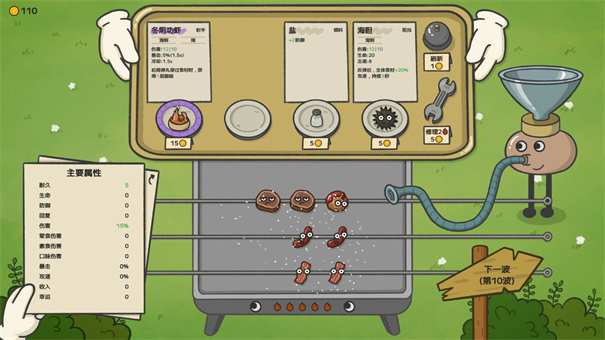 抵御20波鼠潮进攻,每波结束后进入商店阶段,可购买新食材、升级品质或选择调料强化阵容。