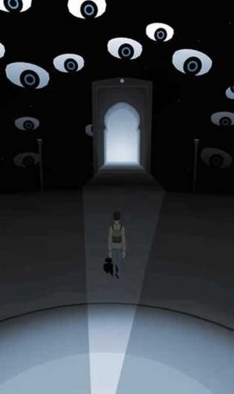 1-第三章开始后主角出现在一个平台上,远处就是白色的影子,起身后追着影子朝前跑。跑到前方的时候,平台中间会突然断开,墙壁上出现眼睛,平台开始转动方向。