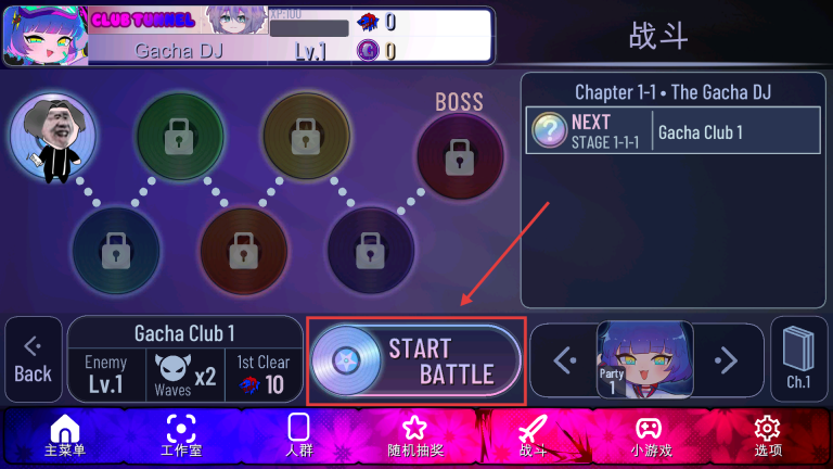 3、在战斗章节选择界面,点击【STARTBATTLE】按钮,就能开启【Chapter1-1】的冒险战斗关卡啦。