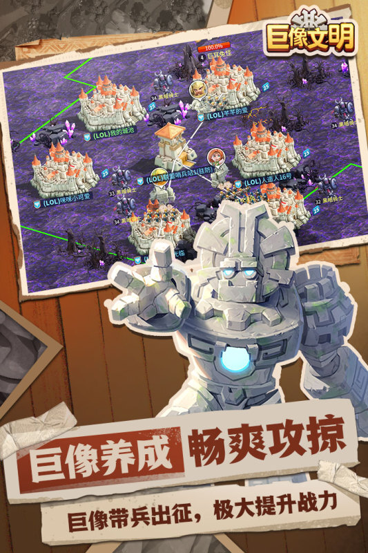 巨像文明这款游戏里有千种组合玩法等你发掘,你还能和部落伙伴一同参与部落战斗展开竞争,既可以加入其他部落,也能自己创建部落并邀请好友加入,是一款十分有趣的角色扮演冒险养成类游戏。