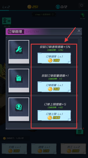 4、在订单管理界面,按订单上限,订单数量,订单速度的顺序升级。