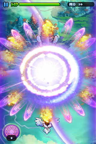 1.游戏采用竖版2D画面呈现,我们将骑着神秘坐骑在空中展开射击对决。这款作品运用Q版卡通风格打造,明星主角们个个都是油光粉面的可爱卡通形象,不过多少还能辨认出他们各自的身份。我们会在森林上空飞行,面对前方的敌人果断将其消灭。