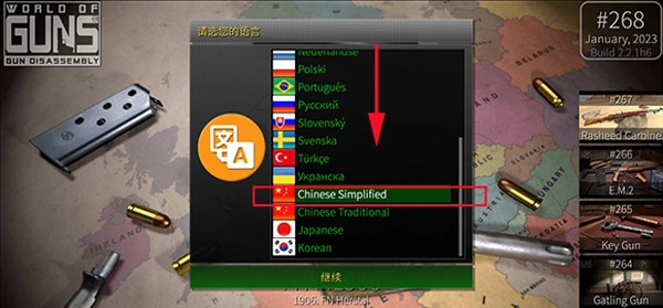 进入游戏后会出现语言设置选项,向下滑动找到“简体中文”并选择就可以了。