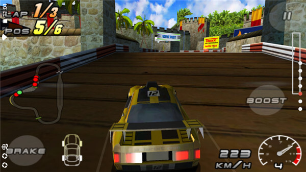 4、游戏提供触屏和重力两种赛车操控方式,初期或许会有些难掌握,但熟悉之后操作体验还是挺不错的。