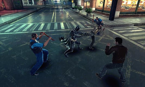 蝙蝠哥终于回归了!一登场就开启了惊险的救人任务——他从高处滑翔而下,迅速解决了三个小喽啰,成功救出了那对年轻夫妇。不过从这里开始,场景里新出现了一个穿蓝色衣服、手持钢管的敌人,这家伙最棘手的地方是会防御。对付他的最佳策略是用招架反击;要是招架不太顺手,也可以在出拳之后立刻按跳跃键绕到他背后,再发起攻击,这招破防效果特别好。