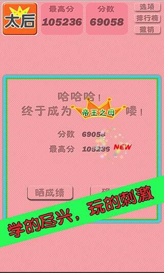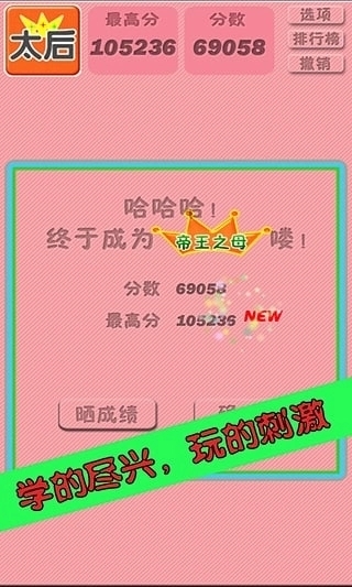 多结局设定:胜利条件包括合成“皇后”或“太皇太后”方块,失败条件为棋盘填满无法移动,增加重玩价值。