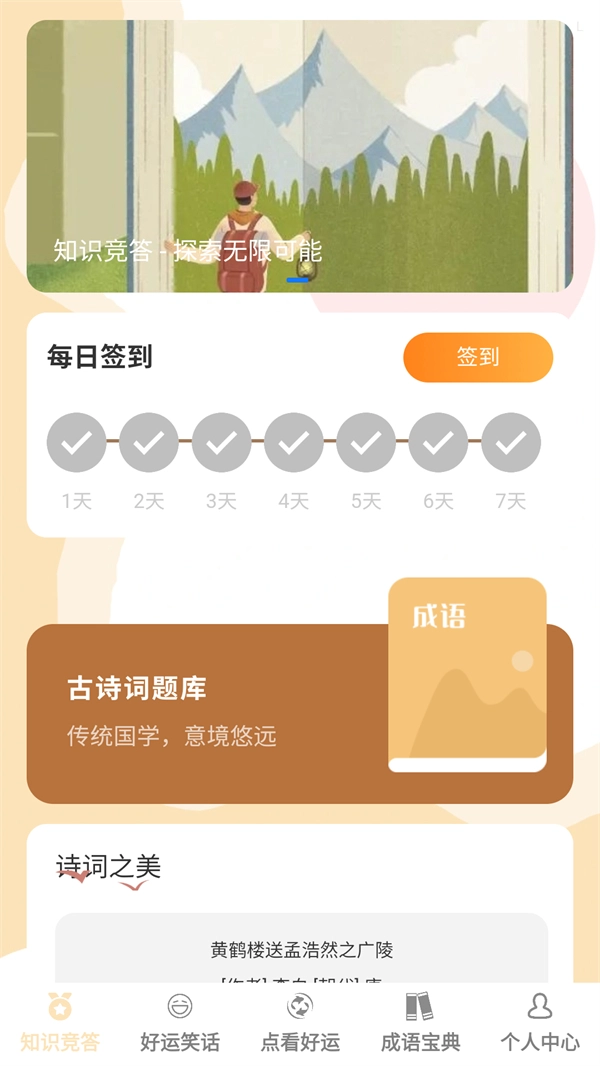 1、知识竞答:作为应用的核心板块,它覆盖了丰富多样的诗词知识领域。用户能够借助每日打卡的形式,漫步于诗词的历史长河,尽情感受古韵的独特魅力。这种不间断的学习过程,既充实了用户的文学储备,又提升了他们对诗词的喜爱程度与鉴赏水平。