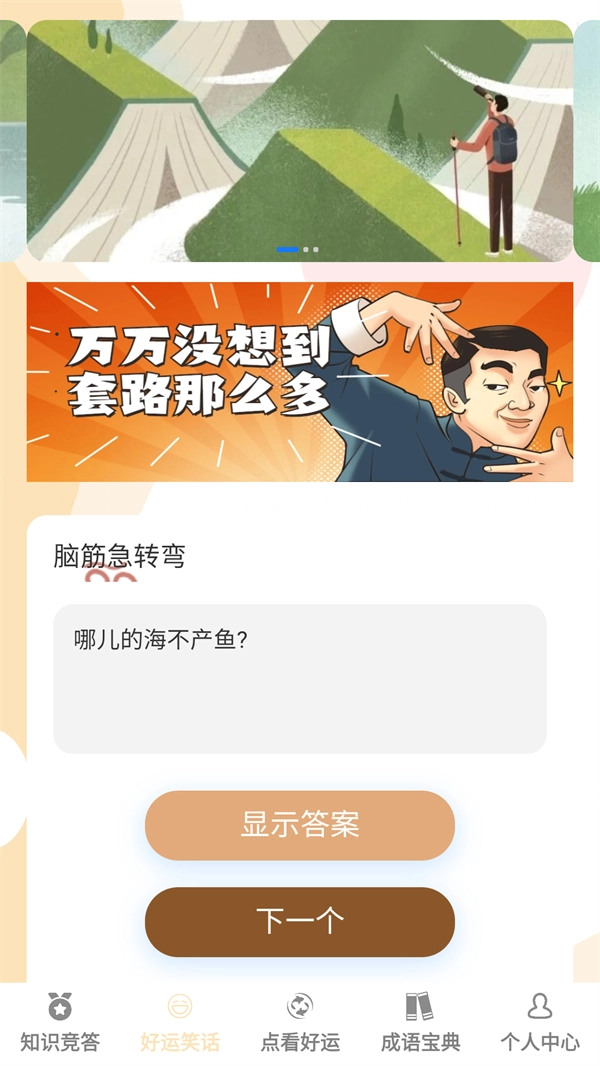 2、好运笑话:除了知识竞答,应用里还专门设置了“好运笑话”板块。这个板块汇聚了海量幽默诙谐的笑话合集与脑筋急转弯题目,能让用户在轻松惬意的氛围里锻炼思维能力,与此同时,也让笑声化作他们日常生活中的幸运符号。