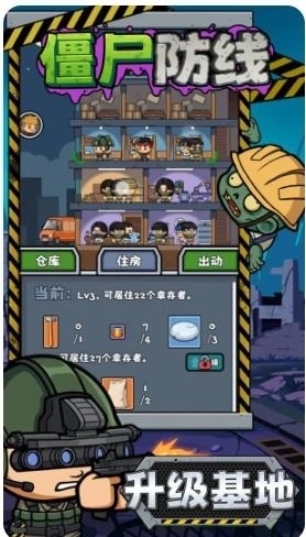 资源搜索:探索关卡收集建材、食物、武器等物资,优先升级仓库与住房以提升资源上限。