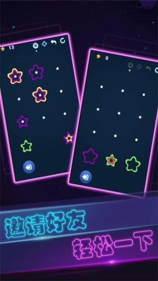 1:游戏里设有9个固定的桩位,玩家需要把每回合游戏给出的星星放到对应的桩位中,只要在横、竖、斜任意一个方向上,凑齐一列三个颜色相同的星星,就能完成消除并获得分数。