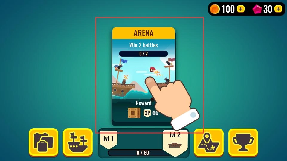 1、进入游戏,能看到竞技场相关任务,显示需赢2场战斗,还有奖励提示,根据指引可开启海战,准备在竞技场中一展身手。