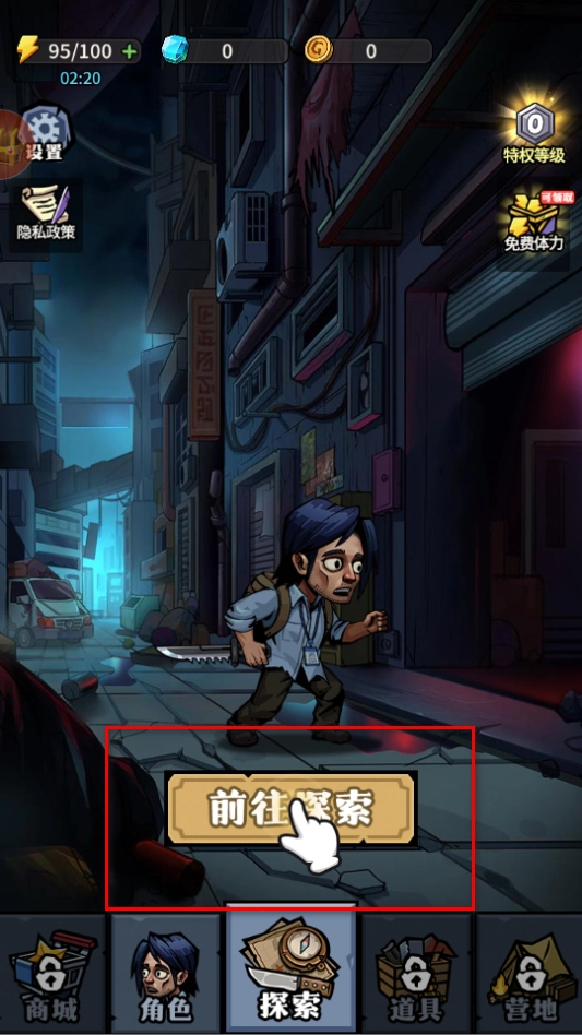 1、点击前往探索按钮,进入探索场景,在场景里会遇到各种僵尸,需要操控角色移动,利用武器和技能与僵尸战斗。