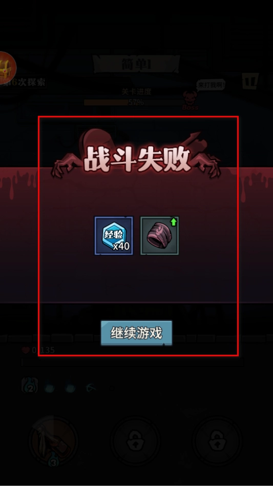 3、若战斗死亡,会显示战斗失败提示,同时获得经验和道具奖励,点击继续游戏按钮,可回到主界面重新开始探索。