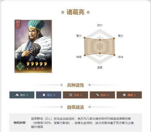 有着接近孔明的属性,配合战法用武通神可以作为法坦,在搭配上郝昭,战斗能力极强。