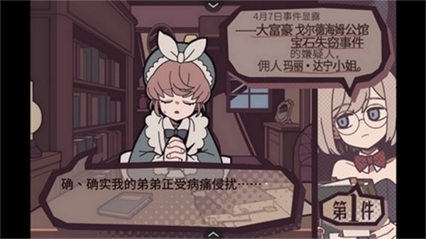 主线案件:包括剧场后巷杀人案、上院议员杀人案、面包房混入戒指案等九起案件,每起案件均需玩家通过对话判断嫌疑人是否有罪。