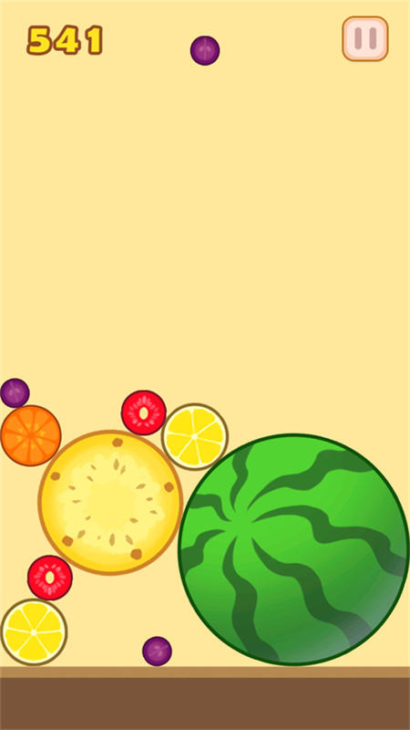 当两个相同的水果碰撞在一起时,它们会合并成一个更大的新水果。例如,两个樱桃合成一个草莓,两个草莓合成一个柿子,以此类推。