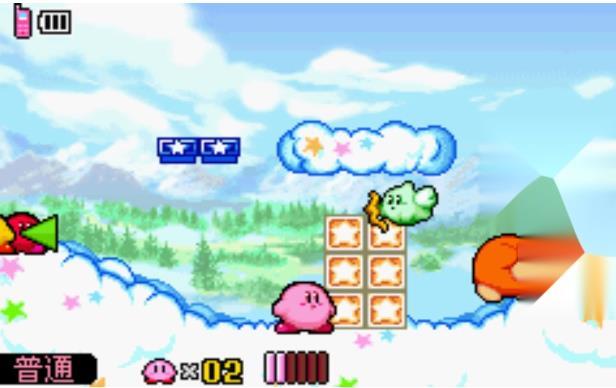 玩家通过方向键控制卡比移动,A键跳跃,B键攻击或吸入。长按B键可以蓄力吸入更多物体,或者将吸入的星形子弹反射出去。