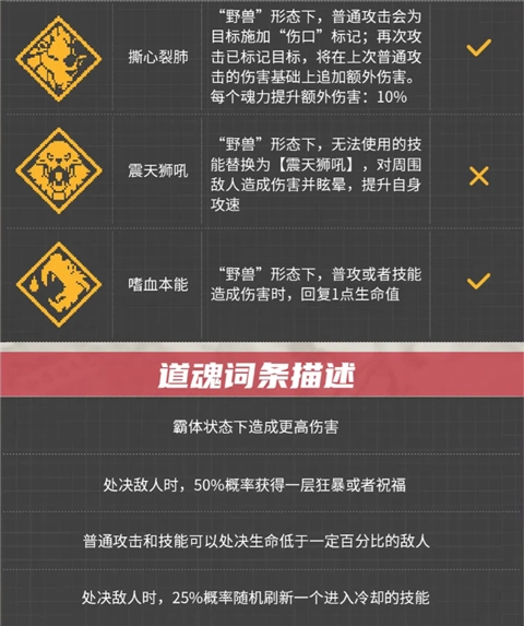 要是选择了【魂力-震天狮吼】,不仅能释放技能眩晕周围的敌人,还能提高自身的攻击速度;再配上【魂力-嗜血本能】,每次攻击敌人都能恢复生命值,持续战斗的能力会大大提升!