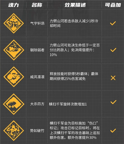 搭配【技能风格-历久弥坚】以及【魂力-气宇轩昂】、【魂力-剔除弱者】这几个要素,能够持续增强力劈山河的技能倍率,让你在战斗里逐步变强,不仅能以强大力量突破千钧阻碍,还能横扫整个战场!