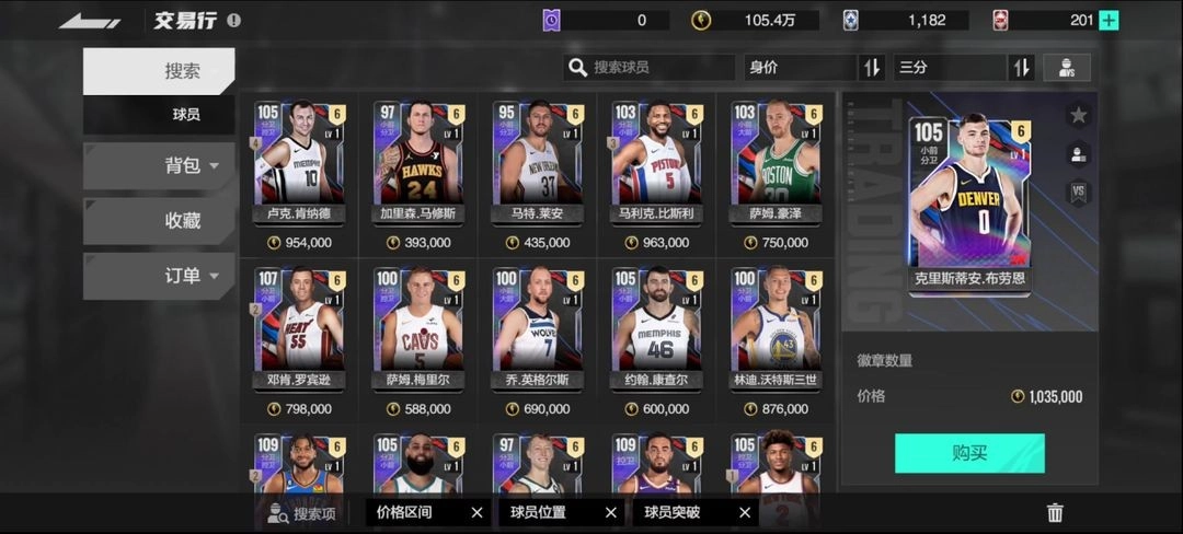 ②在交易市场中,你可以通过搜索栏查看当前上架的球员(这些球员信息会实时更新,你可以将需要的球员收藏起来,以便实时关注其动态);也可以从背包里选择自己想要的球员,调整好所需数量后点击购买,就能完成交易。