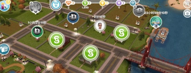 每隔一段时间,玩家打开城镇地图时,会看到已解锁建筑物的顶部出现模拟货币奖励,点击就能领取。这些可领取奖励的建筑物,除了市民的住宅,还涵盖公园、商店等类型;即便建筑物内没有公民,玩家依然能获取奖励。