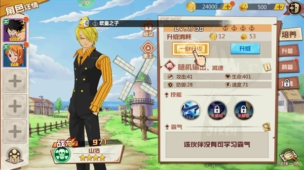 深度羁绊系统:特定伙伴组合(如“草帽一伙”“四皇”)触发属性加成与全屏合击技,例如路飞+索隆组合提升暴击率20%,并解锁“三刀流·橡胶乱打”合击技。