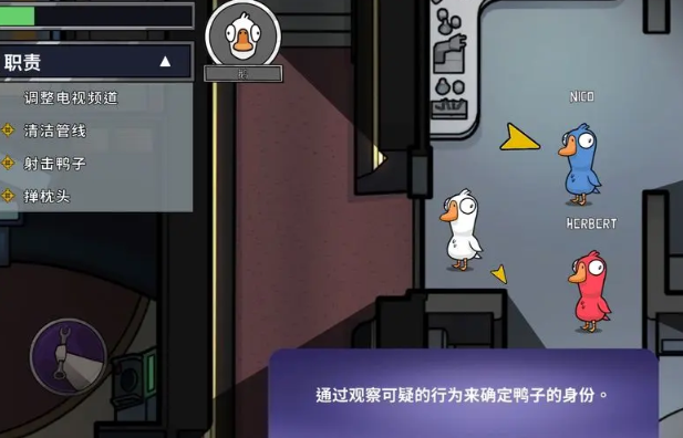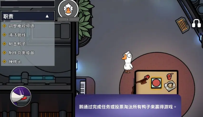基础流程:玩家进入房间 → 分配角色(鹅/鸭/中立)→ 出生在自己的出生点 → 鹅做任务推进进度,鸭杀人破坏,中立完成个人目标 → 发现尸体或按铃开会 → 发言推理投票 → 淘汰玩家或跳过 → 重复直至某阵营达成胜利条件。