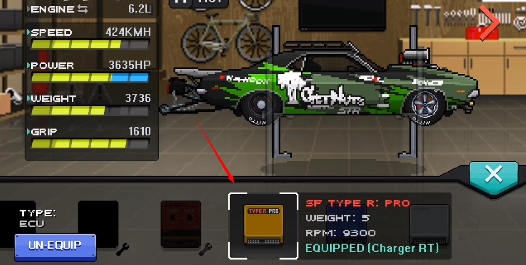 3、在车库里挑选赛车,找到刚买的升级零件并使用它们